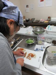 ラーメン調理中。取材に来ていただいた北羽新聞の渡部さんが