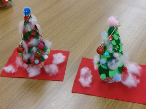 フェルトを貼ってツリー🎄を作り、飾りつけをしていきます。
